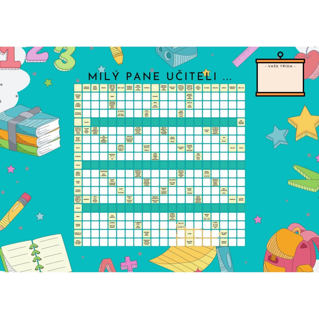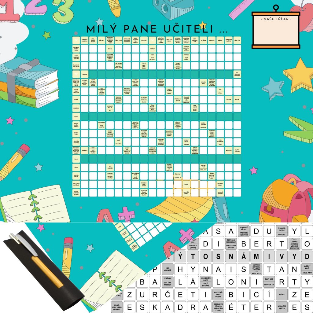 Poděkujte milému panu učiteli za trpělivost co s vámi měl při výuce a řekněte mu to křížovkou. Pokud by měl pan učitel "problém" s vyluštěním křížovky, může využít políčka s pomůckami, které jsou po stranách. Pro úplnou jistotu je ke křížovce přiloženo vytištěné řešení. Kdyby se chtěl vymlouvat, že nemá čím luštit, k výtisku křížovky dostanete i kvalitní kuličkové pero. Ještě ale sada poděkování panu učiteli není kompletní, musíte křížovku přece v něčem předat. Na to jsme také mysleli za vás, obálka bude přiložena v zásilce.